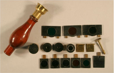 The repeating circle, Borda type, consists of a circular varnished brass frame, with a detached wooden handle. The index arm carries the index glass and the telescope arm carries the horizon glass. The double-ended tangent screw and clamping screw are located on the back of the index arm. A second double-ended tangent screw and clamping screw are at the ocular end of the telescope arm. The instrument has five detached shades, two red, two orange, and one green, and three detached horizon shades ( one missing), two green, and one red. Index- and horizon-glass adjustment is made by square-headed screws and a detached key. Attached to the circle is a magnifier on a 60mm swivelling arm. There are also two threaded telescope brackets with perpendicular adjustment made by a rising-piece and two milled knobs. No extra telescopes. Screwdriver and small magnifying glass missing. Accompanying the circle is a sight-tube is 82 mm in length, an extra drawtube for the magnifier, which is 21 mm long, two red and one green shaded eyepieces, five additional detached shades, two rectangular brackets and an adjusting key. The instrument has a varnished brass limb with an inlaid silver scale from 0° to 720° by 20 arcminutes. Brass finder arc from 155° to 0° to 145° by 1°, with two brass stops. The repeating circle has three silver verniers measuring to 1 arcminute, with zeros at the right. The repeating circle is contained in a square fitted mahogany box.